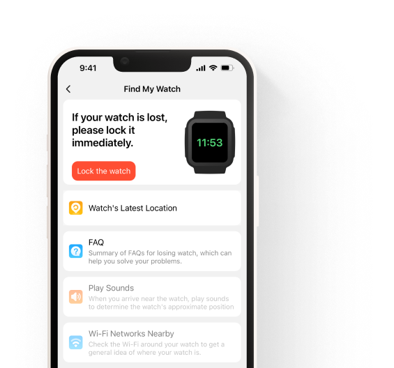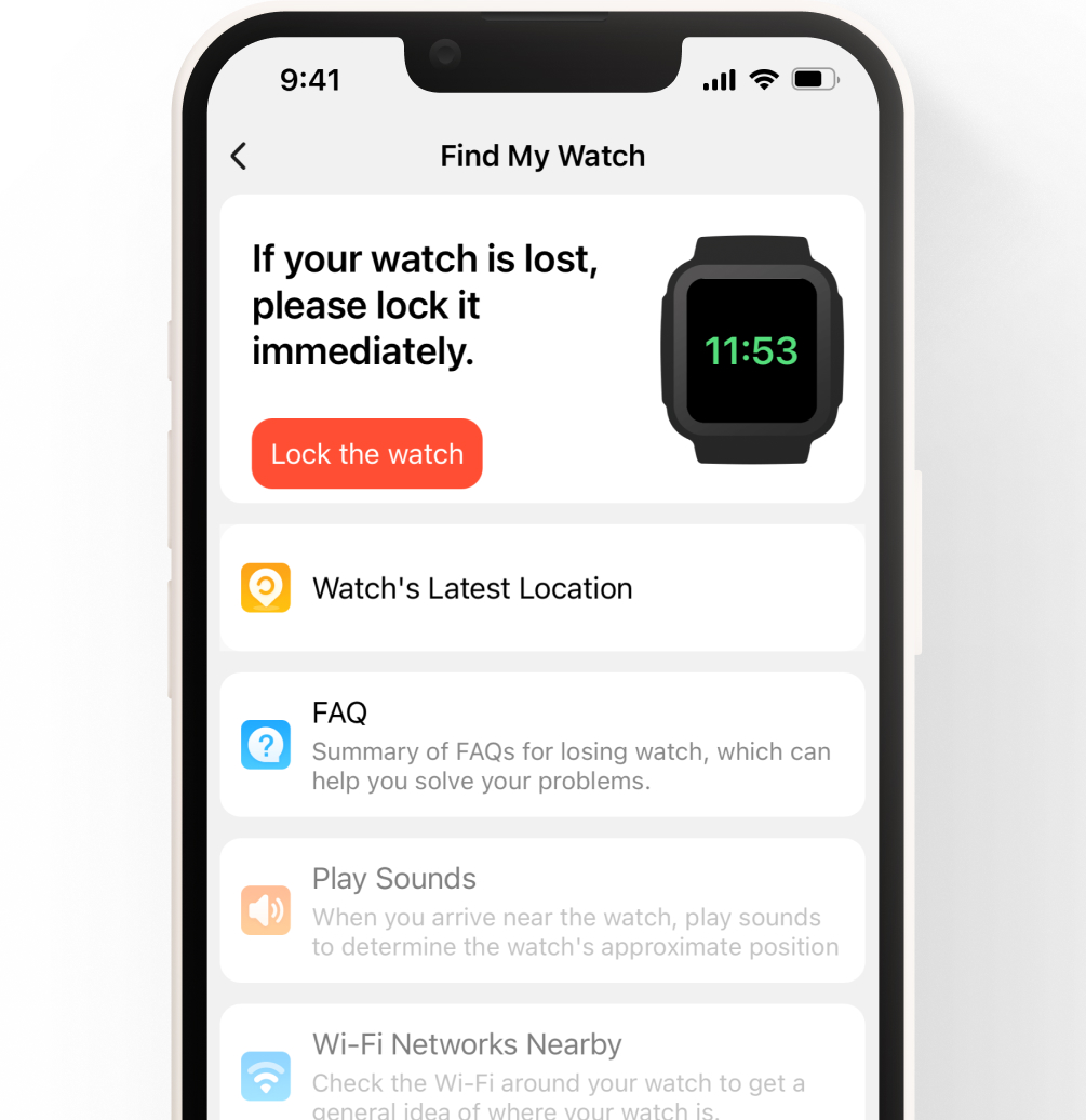 Meine Uhr finden. Wenn die Uhr verloren geht, kannst du sie aus der Ferne sperren und über die Eltern-App ihren Standort in Echtzeit verfolgen.