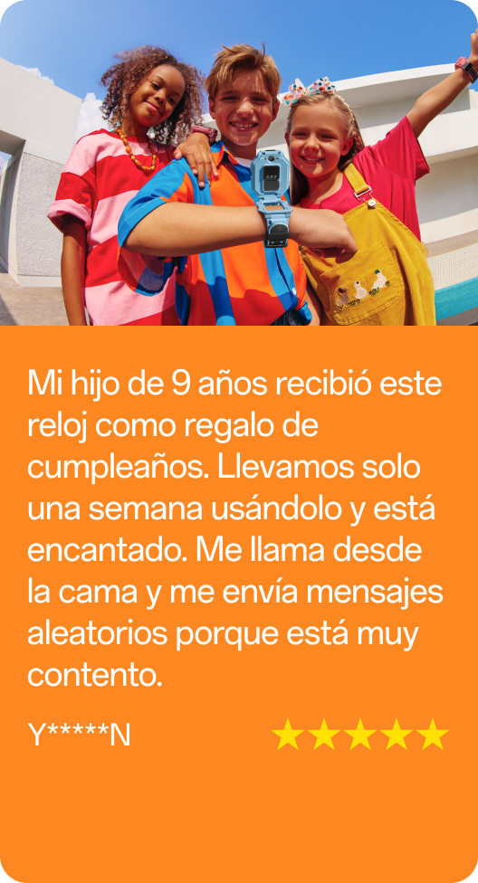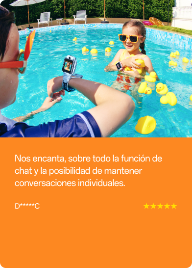 “El reloj es resistente al agua hasta 20 metros. Así que tu niño/a no tiene que quitárselo cuando salte a la piscina o al lago. Ha superado más de 20 000 pruebas de caída y cumple con todos los requisitos normativos de la UE.”